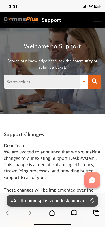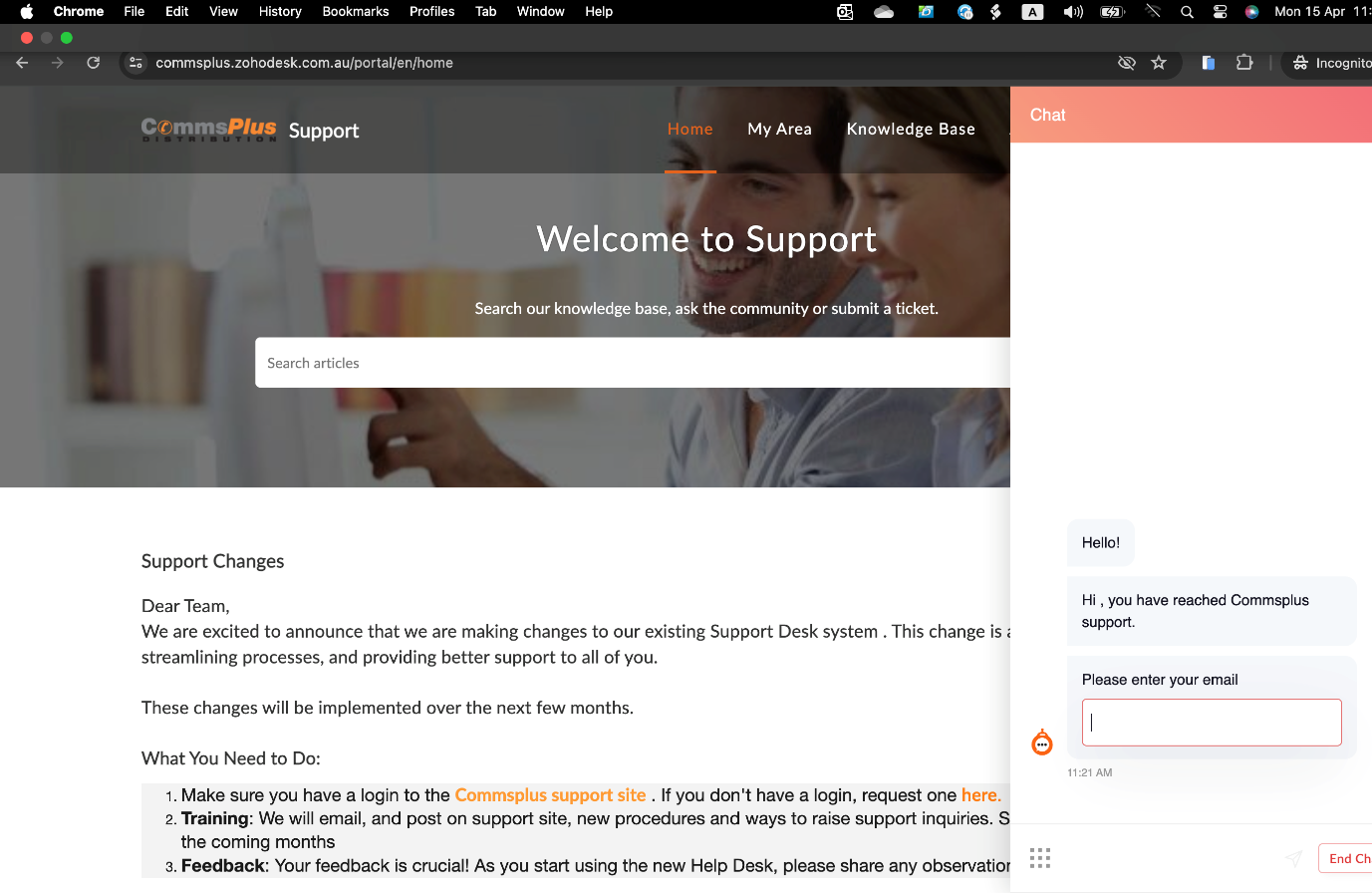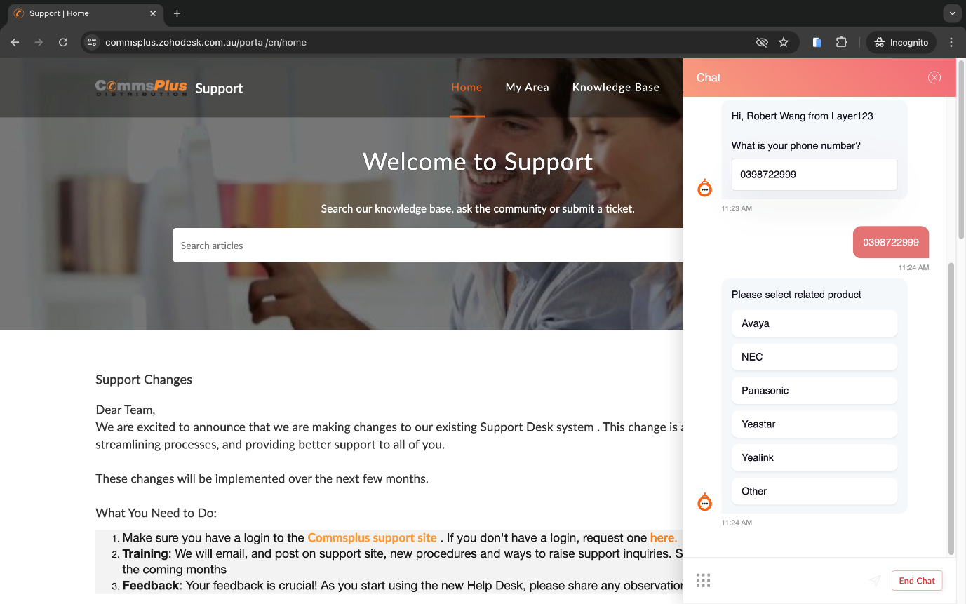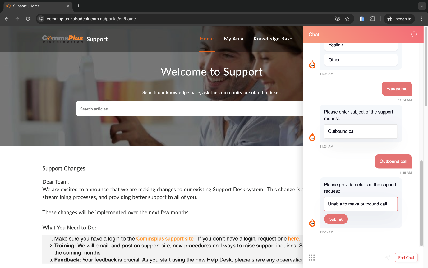 CommsPlus support website provides a chat bot enabling CommsPlus partners to lodge support tickets with a valid partner account email address quickly.
