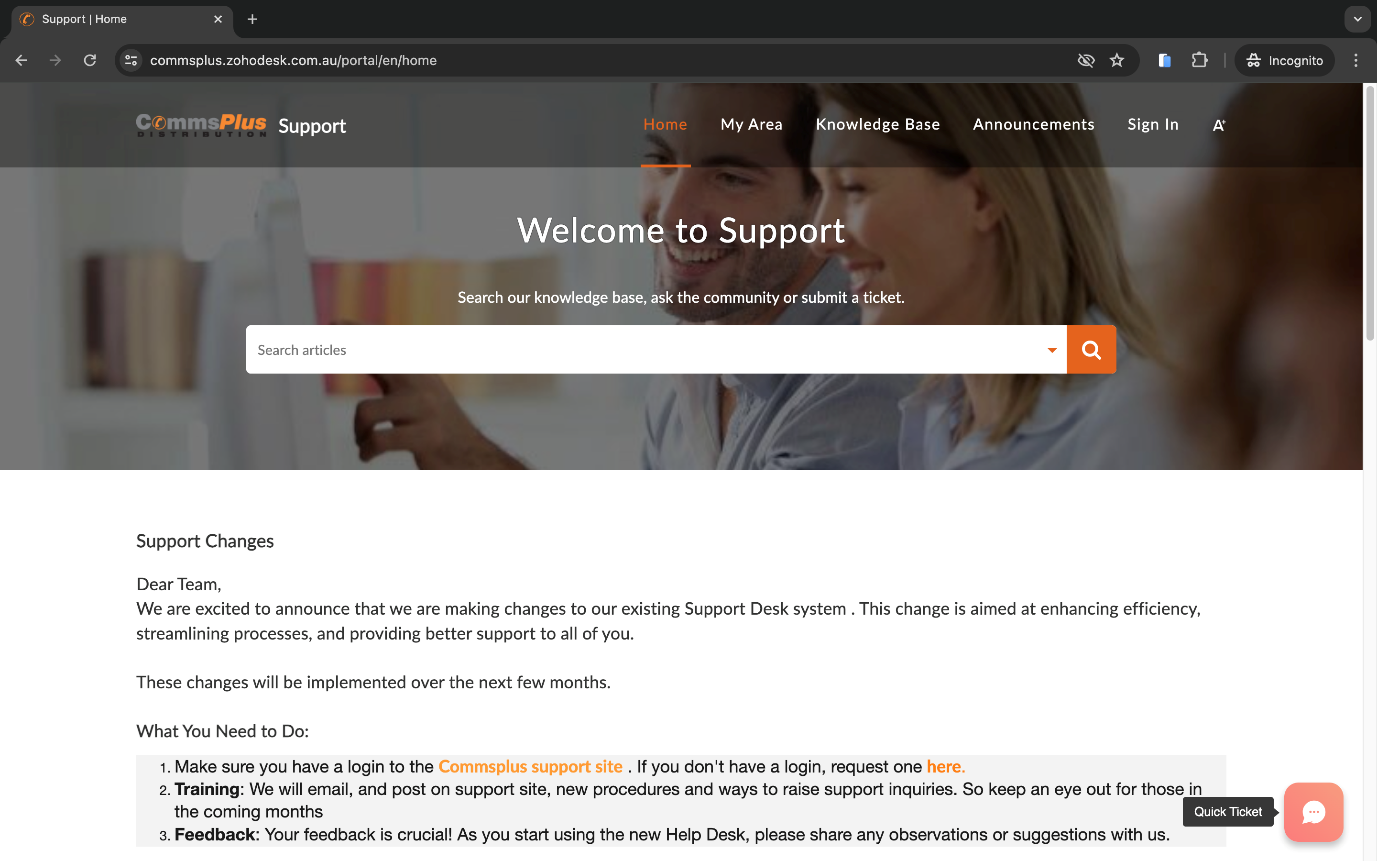 This is achieved by the “Quick Ticket” guided conversation chat bot on the bottom right-hand corner on the CommsPlus support website shown below.