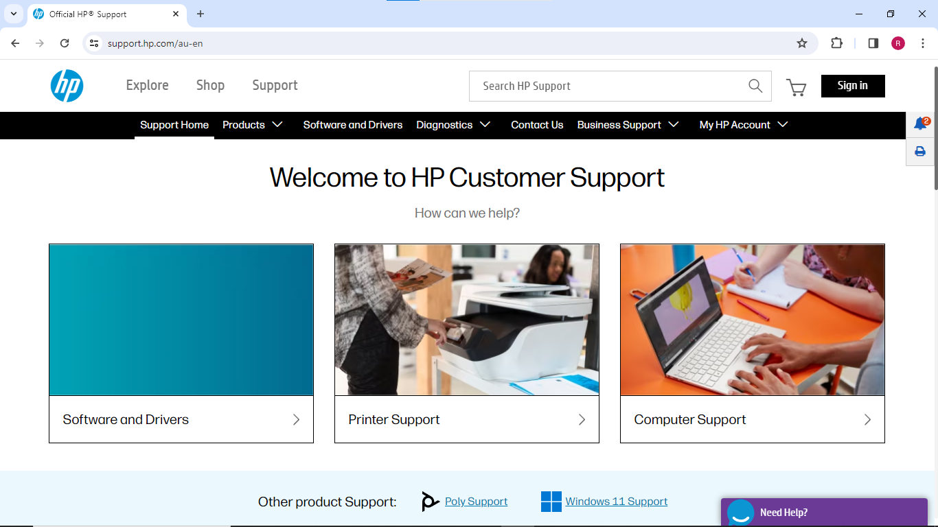 Screenshot: HP support page – Register Your Product following ”Poly Support” near page bottom selection link