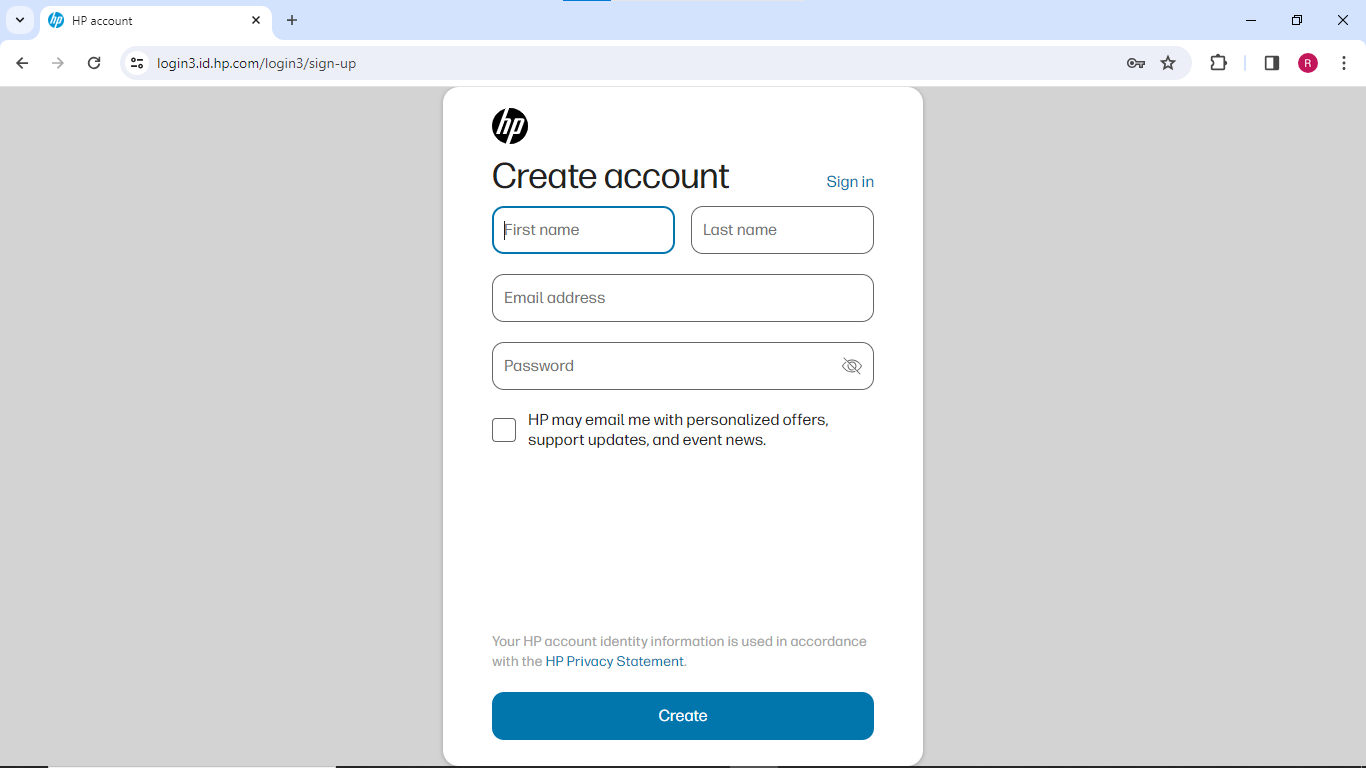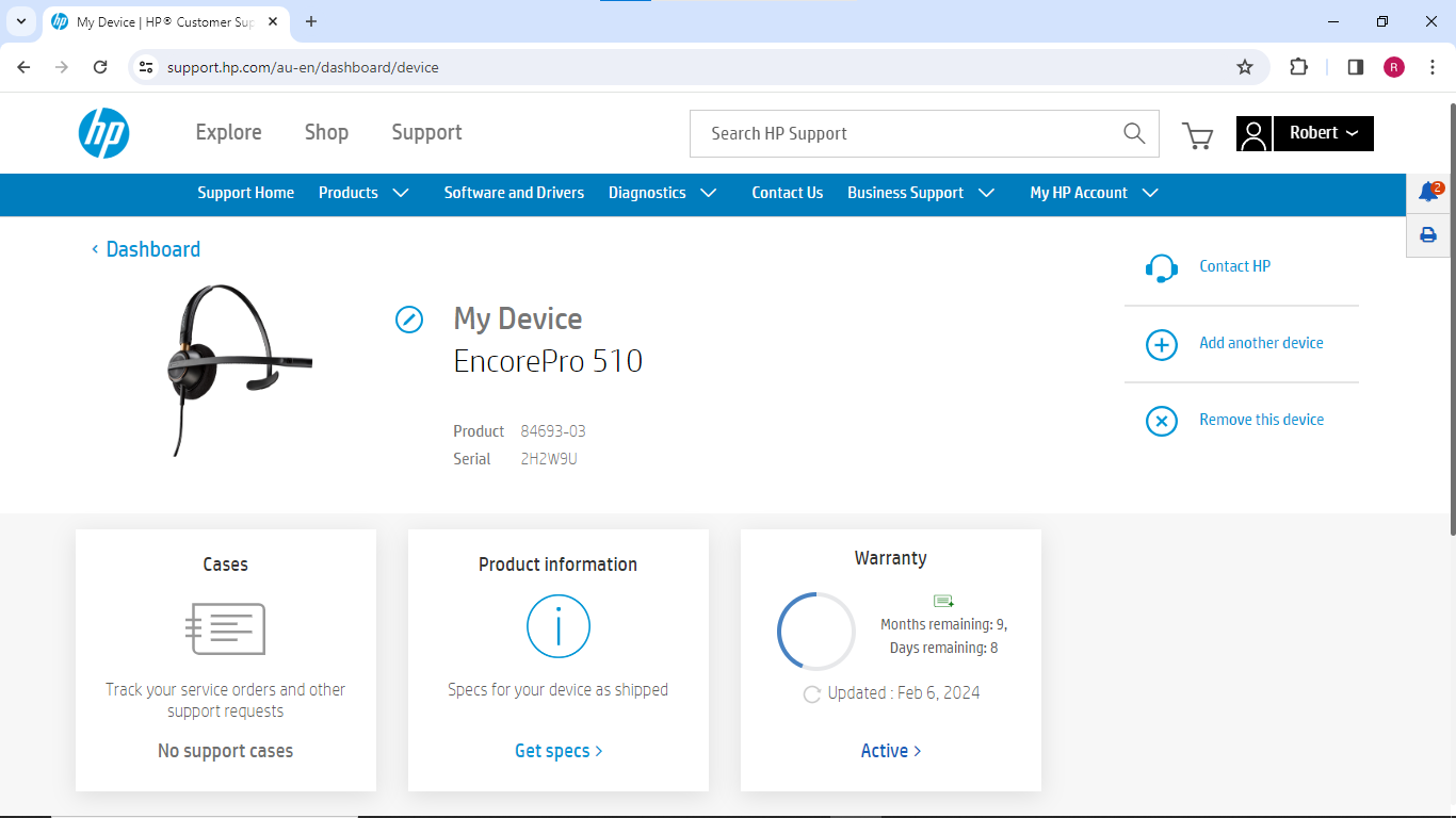Screenshot: HP support welcome page – login required, login with you new credentials